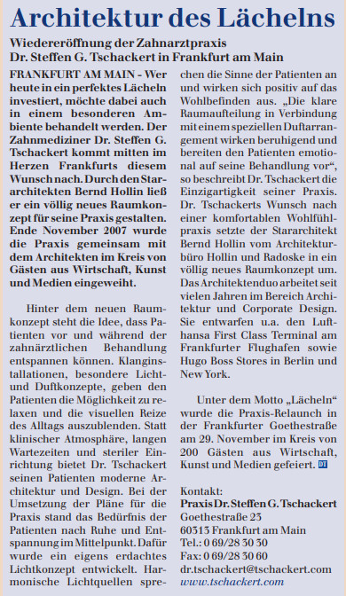 Wer heute in ein perfektes Lächeln investiert, möchte dabei auch in einem besonderen Ambiente behandelt werden. Der Zahnmediziner Dr. Steffen G. Tschackert kommt mitten im Herzen Frankfurts diesem Wunsch nach…